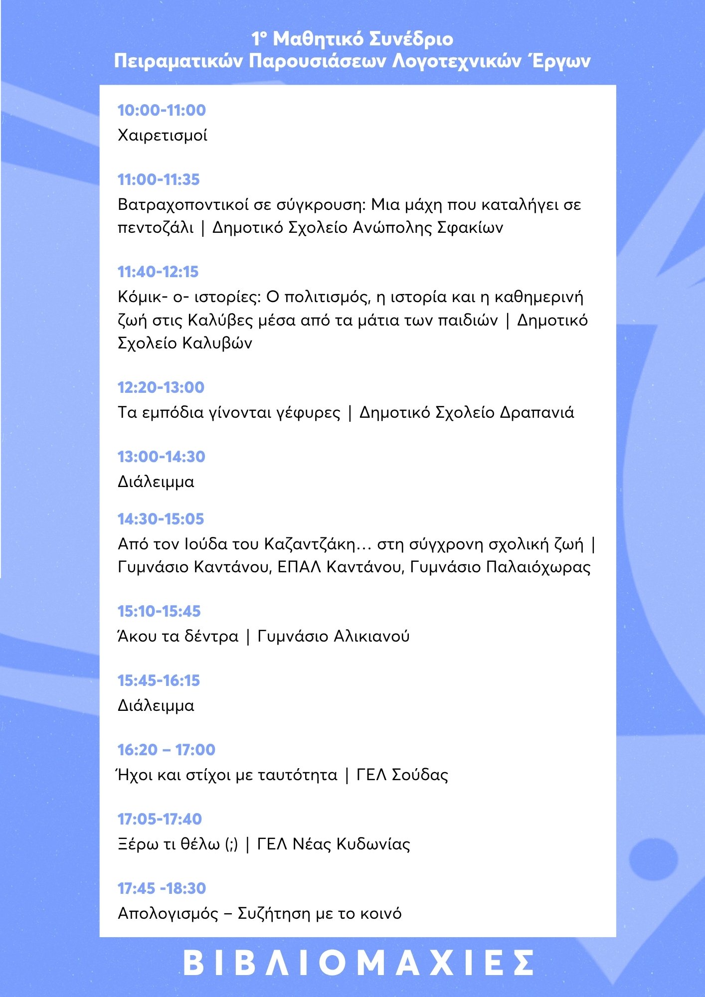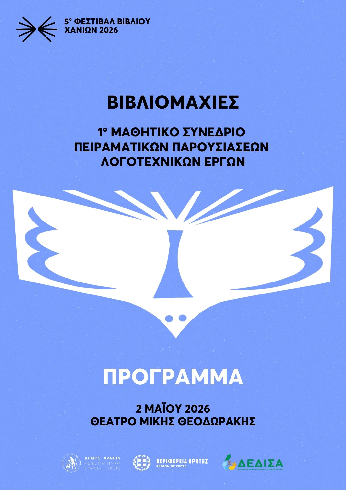 Το Σάββατο 2 Μαΐου 2026, στο Θέατρο «Μίκης Θεοδωράκης», θα πραγματοποιηθεί το 1ο Μαθητικό Συνέδριο Πειραματικών Παρουσιάσεων Λογοτεχνικών Έργων,  όπου μαθητικές ομάδες από σχολεία του Νομού Χανίων (Δημοτικό σχολείο Καλυβών, Λύκειο Νέας Κυδωνίας, Λύκειο Σούδας, Γυμνάσιο Καντάνου, ΕΠΑΛ Καντάνου, Γυμνάσιο Παλαιόχωρας, Δημοτικό Σχολείο Ανώπολης, Δημοτικό Σχολείο Δραπανιά, Γυμνάσιο Αλικιανού) που παρακολούθησαν τα εργαστήρια του εκπαιδευτικού προγράμματος «Βιβλιομαχίες» θα παρουσιάσουν συλλογικές, διακαλλιτεχνικές εργασίες βασισμένες σε λογοτεχνικά έργα της ελληνικής και παγκόσμιας γραμματείας, και θα ακολουθήσει συζήτηση με το μαθητικό και ενήλικο κοινό.